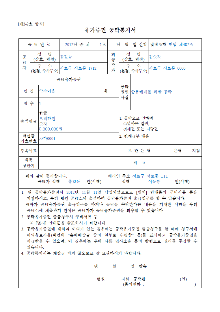 유가증권 공탁통지서