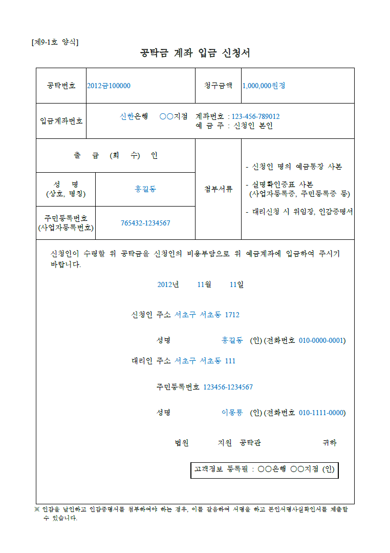공탁금 계좌 입금 신청서