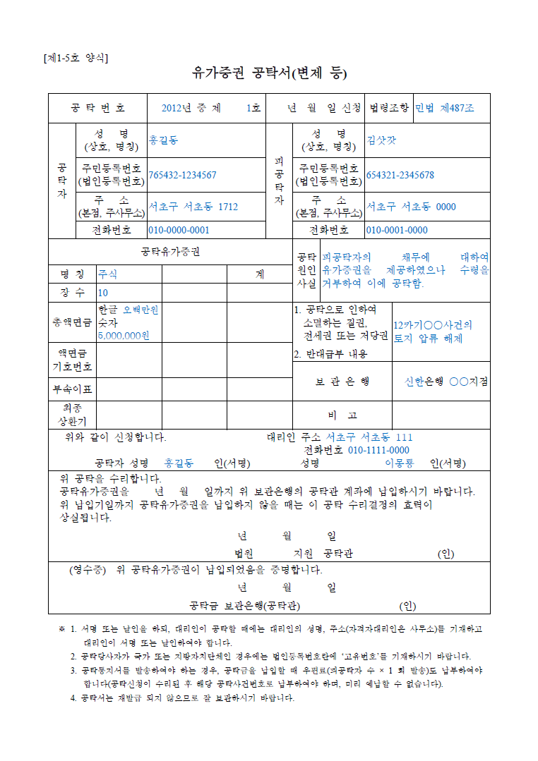 유가증권 공탁서(변제등)