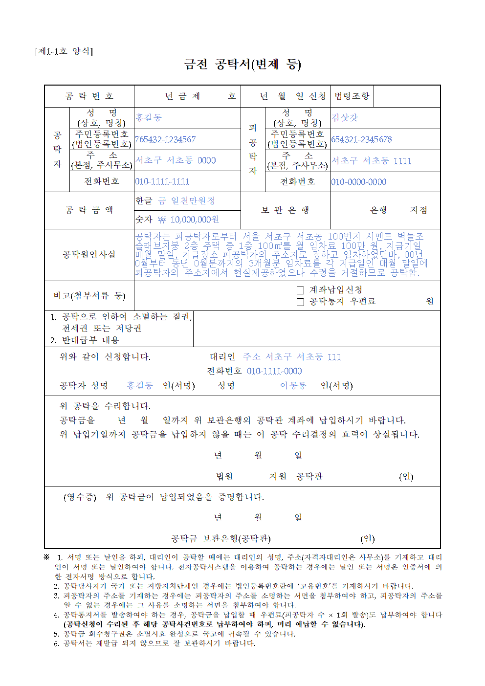 금전 공탁서(변제 등)